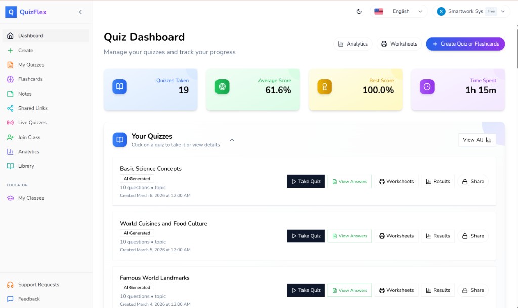 If your teacher or institution uses QuizFlex, the Student path streamlines your experience. Instead of being overwhelmed with creation tools, your dashboard is focused on what matters most: joining classes, taking quizzes, and reviewing your results.