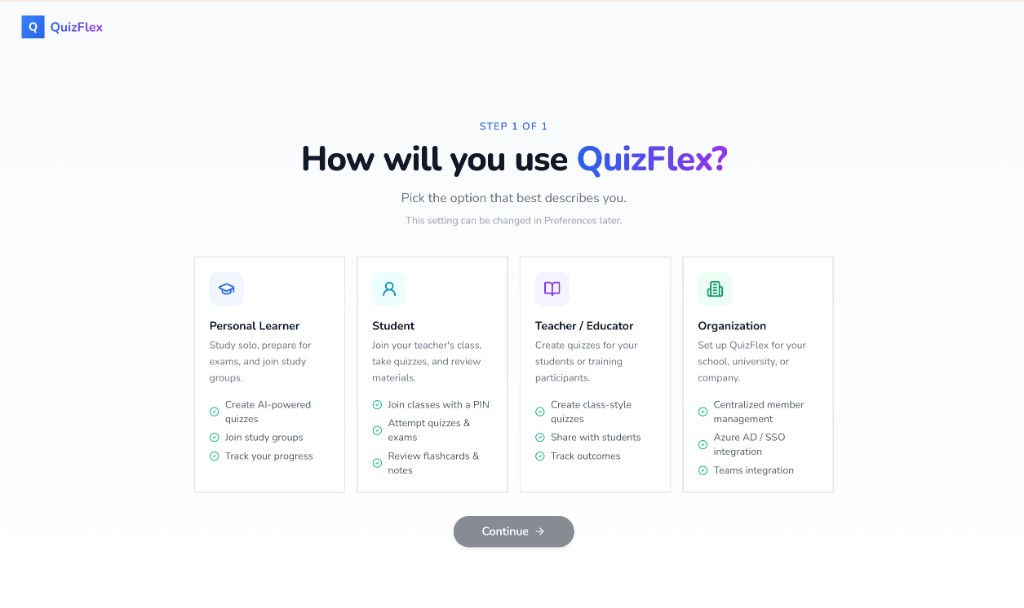 Whether you're a solo learner exploring AI-generated quizzes, a student joining your first class, a teacher building a digital classroom, or an admin deploying QuizFlex across your organization — the onboarding step ensures you hit the ground running.